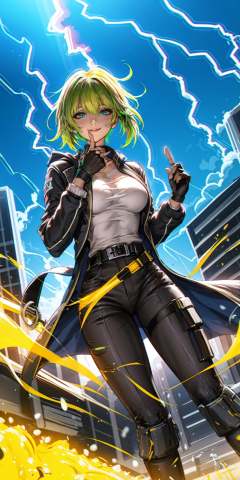 HEZI,Hot girls,Two dimensional,hand drawing,atmosphere,weapon,tattoo,1girl, twintails, fingerless gloves, gloves, bangs, pants, weapon, jacket, green hair, smile, parted bangs, lightning, blonde hair, open clothes, open jacket, gun, black gloves, bandaid, collarbone, shoes, holding weapon, black pants, holding, shiny, glowing, solo focus, index finger raised, brown gloves, long sleeves, looking at viewer, belt, closed mouth, official alternate costume, brown pants, solo, hand up, shiny hair, shirt, black jacket, bandaid on face, short hair, green eyes, blue eyes, long hair, holding gun, breasts, short twintails, puffy sleeves, coat, outdoors, teeth, building, glowing eyes, 1boy, brown belt<lora:辣妹-000022:0.7>,