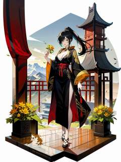 hezi,Japanese and Korean art,game characters,special effects,long hair,1girl,black hair,multicolored hair,solo,weapon,holding,flower,chain,hair over one eye,full body,ponytail,holding weapon,sword,blonde hair,two-tone hair,standing,looking at viewer,dress,breasts,white background,closed mouth,streaked hair,architecture,wide sleeves,mountain,gourd,holding sword,black dress,black footwear,detached collar,east asian architecture,smoke,cleavage,yellow flower,long sleeves,blue eyes,<lora:日韩立﷿-000013:0.7>,