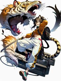 hezi, Japanese and Korean art, game characters, special effects, 1girl, weapon, sword, animal ears, sheath, tail, holding weapon, shoes, sneakers, holding, katana, holding sword, solo, pants, white pants, black hair, long sleeves, full body, bag, tiger ears, open mouth, shirt, unsheathing, white background, yellow shirt, tiger girl, simple background, scabbard, ponytail, yellow eyes, looking at viewer, midriff peek, long hair, sheathed, brown eyes, hair between eyes, tiger tail, holding sheath, animal ear fluff, teeth, brown hair, monster, backpack, cat ears, transparent background, :o,<lora:日韩立﷿-000013:0.7>,