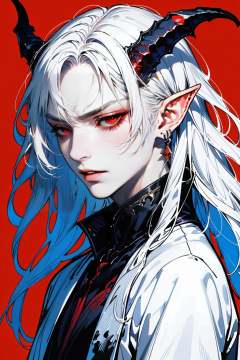 hezi,brilliant color,brush texture,beauty,solo, 1boy, male focus, long hair, red eyes, jewelry, pointy ears, red background, earrings, white hair, parted lips, half-closed eyes, portrait, looking at viewer, bangs, horns, from side, upper body, head wings, bishounen,vampire,,<lora:纯彩﷿丽质感-000016:0.65>,