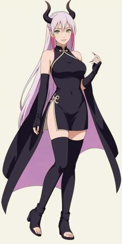 hezi,Naruto character design,Character Design,animation art,quadratic,bright colors,1girl,solo,long hair,thighhighs,green eyes,dress,full body,looking at viewer,veil,grey background,smile,breasts,pelvic curtain,simple background,bridal gauntlets,multicolored hair,standing,large breasts,black thighhighs,gloves,very long hair,black hair,high heels,hair ornament,purple dress,elbow gloves,mouth veil,purple hair,see-through,boots,fingernails,bare shoulders,black gloves,purple footwear,closed mouth,chinese clothes,watson cross,hair stick,streaked hair,personification,horns,pink hair,<lora:火影人物设计2.0-000014:0.6>,