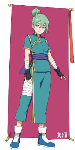 hezi,Naruto character design,headband, Character Design, animation art, quadratic, bright colors, 1girl, solo, purple eyes, smile, hair bun, single hair bun, green hair, looking at viewer, white background, full body, bandages, boots, simple background, standing, bandaged arm, bangs, short sleeves, black footwear, straight-on, clenched hands, closed mouth, sash, short hair, pants, vest, blue footwear, hair between eyes, wrist wrap, blue sash, sidelocks, fingerless gloves, arm wrap, chinese clothes, arms at sides<lora:火影人物设计2.0-000014:0.6>,