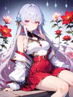HEZI,splendid atmosphere,rich in colors,beautiful,1girl,solo,long hair,flower,sitting,jewelry,looking at viewer,earrings,tassel,white hair,smile,bare shoulders,hair between eyes,skirt,closed mouth,breasts,tassel earrings,white flower,long sleeves,red skirt,thighs,pink flower,feet out of frame,detached sleeves,jacket,very long hair,blue flower,hair rings,dress,sleeveless,off shoulder,bare legs,red eyes,grey hair,white shirt,shirt,multicolored hair,medium breasts,crystal,pleated skirt,hair ornament,