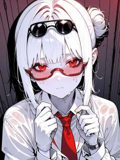 HEZI, splendid atmosphere, rich in colors, beautiful, 1girl, solo, shirt, white hair, necktie, red eyes, red necktie, white shirt, looking at viewer, colored skin, collared shirt, white skin, hair bun, pale skin, upper body, sunglasses, tattoo, gloves, watch, tinted eyewear, red-tinted eyewear, hair ornament, sleeves rolled up, adjusting eyewear, white gloves, wristwatch, closed mouth, looking over eyewear, sidelocks, long sleeves, colored sclera, neck tattoo, single hair bun, black sclera, short hair, hand up, glasses, expressionless, wing collar, grey skin, vest, chain-link fence, wet, fence