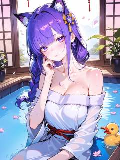 HEZI, splendid atmosphere, rich in colors, beautiful, 1girl, breasts, raiden shogun, rubber duck, animal ears, purple hair, looking at viewer, hair ornament, cleavage, solo, bottle, long hair, mole, purple eyes, mole under eye, tattoo, blush, braid, large breasts, flower, water, petals, cat ears, bare shoulders, purple nails, animal ear fluff, off shoulder, nail polish, braided ponytail, plant, towel, earrings, purple flower, potted plant, extra ears, upper body, wet, partially submerged, jewelry, tassel, hair flower, indoors, arm under breasts, window, white towel, multicolored hair, collarbone, falling petals, makeup, hand up, blunt bangs, bathing, single braid, tassel hair ornament, kemonomimi mode, tomoe \(symbol\), bath, very long hair, eyeliner, kimono, mitsudomoe \(shape\), sidelocks, sake bottle, blue hair, petals on liquid