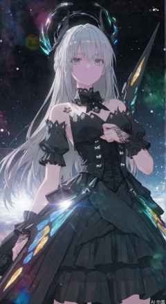 liv(PGR),1girl, solo, long hair, breasts, looking at viewer, bangs, dress, cleavage, hair between eyes, bare shoulders, medium breasts, closed mouth, standing, short sleeves, grey hair, detached sleeves, puffy sleeves, black dress, puffy short sleeves, grey eyes, black bow, tattoo, halo