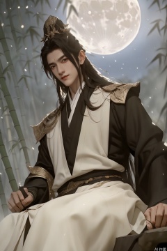 handsome man,handsome man,A handsome man wearing dark green ancient style clothes is sitting in the bamboo forest at night with a bright moon in the sky.,