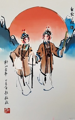 This Peking Opera - themed watercolor features an old sage in a long, brown robe with mountain and river patterns. His face shows wisdom, and he wears a simple hat made of bamboo. The background is a plain beige, allowing the sage to stand out. He holds a walking stick with a carved dragon head in his left hand. The painting style is serene and profound, in keeping with traditional Chinese art.