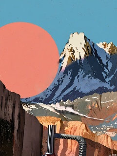 PTYS, A digital illustration featuring a stylized, minimalist landscape with a large, pinkish-red sun at the center, emitting a thick, white plume of smoke. The sky is a gradient of deep teal to lighter blue. In the foreground, a tall, metallic chimney with a small, square window at its base emits the smoke. The background includes a range of brown, rocky hills and mountains. The overall color palette is muted, with earthy tones dominating the landscape and a stark contrast created by the vivid smoke. The illustration has a grainy texture, giving it a retro, vintage feel.