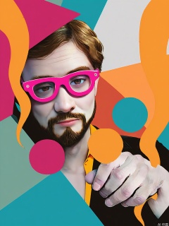 PTYS, Photograph of a man with a beard and short, wavy hair, wearing a black suit, a bright orange shirt, and pink sunglasses. He is seated and resting his head on his hand, looking directly at the camera. The background is a mix of abstract shapes and colors, including pink, blue, and yellow. The image is overlaid with a grayscale photo of the man, creating a layered effect. The overall aesthetic is playful and vibrant, with a modern, abstract art style.