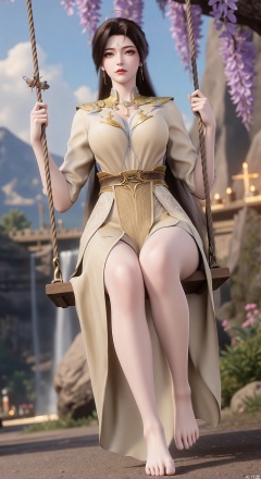 SFW,(masterpiece, top quality, best quality, official art, beautiful and aesthetic:1.2),Dynamic posture,(Sitting on the swing:1.39),natural skin texture,(Milky skin:1.2),1gir,solo,long Dress,