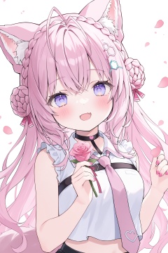quality,amazing quality,very aesthetic,absurdres,1girl,loli,virtual youtuber,solo,animal ears,hakui koyori,pink hair,looking at viewer,long hair,flower,fang,braid,animal ear fluff,choker,blush,necktie,shirt,hair bun,white shirt,open mouth,holding,bangs,wolf ears,crown braid,sleeveless,hair ornament,upper body,smile,blue eyes,black choker,pink nails,antenna hair,purple eyes,petals,rose,nail polish,tail,pink flower,sleeveless shirt,hair between eyes,:d,white background,