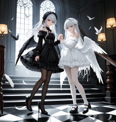multiple girls, 2girls, dress, black dress, blue eyes, long hair, red eyes, black vs white, white dress, feathers, pantyhose, lolita fashion, checkered floor, holding hands, hair flower, high heels, white flower, flower, hair ornament, looking at viewer, frills, interlocked fingers, hairband, frilled dress, black footwear, very long hair, white gloves, wings, feathered wings, low wings, white hair, gloves, closed mouth, gothic lolita, grey hair, blue eyes, long sleeves, jewelry, shoes, off-shoulder dress, bird, white pantyhose,tassel, floating,stairs,loli,mary janes, cinematic lighting, contour deepening, high-key and low-variance brightness scale, soft light, depth of field,(hiten \(hitenkei\):0.4),(rimuu:0.5),(mignon:0.5),(sheya:0.6),(jima:0.8),iumu,yunsang,ningen_mame,omone_hokoma_agm, official art,depth of field,best quality,amazing quality,very aesthetic,absurdres,best quality,masterpiece,ultra detailed, newest,8K,HDR,masterpiece,best quality,newest,absurdres,highres,very awa,
