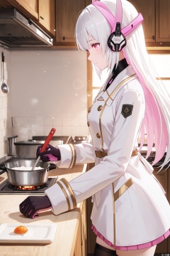 1girl,liv-eclipse/(punishing gray raven), solo, long hair, bangs, thighhighs, gloves, long sleeves, white hair, boots, black gloves, black thighhighs, pink eyes, headgear, headphones, white coat, pink inner hair,white apron ,holding a ladle, cooking, kitchen, wooden table, wooden walls, warm lighting, bubbles,soft gentle eyes,gentle expression,depth of field, light particles, lens flare, masterpiece,best quality,((artist:reoen),(artist:fuzichoco),(artist:atdan),(artist:torino_aqua:0.5),year 2024:0.5),(artist:omone_hokoma_agm:0.8), 2d, anime,from side,