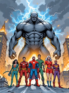 ETHB, A vibrant, marker and ink drawing in a bold, graphic novel style. A team of superheroes, each with their own unique powers and costumes, stand together on a rooftop, looking out over a city in peril. The city is filled with flames and smoke, and a giant monster looms in the distance. The superheroes' faces are determined and brave, and they strike dynamic poses, ready to fight. The background is a dark, stormy gray, with lightning flashing in the sky. The mood is one of urgency and heroism.