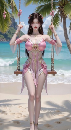 SFW,(masterpiece:1.2),best quality,absurdres,masterpiece,original,extremely detailed wallpaper,perfect lighting,Golden sandy beach covered with vibrant flowers, turquoise waves gently lapping the shore, elegant woman in embroidered qipao swinging on a wooden swing under coconut trees, bright flower clusters spreading from sand to palm tree roots, soft natural light filtering through coconut leaves, ocean breeze lifting hair and qipao hem, high-resolution details showcasing petal textures and silk fabric sheen, ultra-wide angle lens capturing coastline panorama, cinematic color grading with soft focus on the central figure,(huge breasts:2.99),(full breasts:2.99),Xzhihua,Xsiyouyou,Xyanruyu,Xmoxiaonan,Xyeqingxian