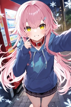 1girl, solo, long hair, looking at viewer, blush, smile, bangs, skirt, hair ornament, long sleeves, hair between eyes, very long hair, standing, yellow eyes, pink hair, pleated skirt, outdoors, hairclip, hood, black skirt, grin, collar, hoodie, hood down, snowflakes, red collar, blue hoodie, vending machine