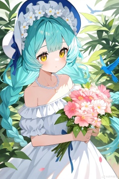 1girl, flower, dress, solo, holding, bouquet, long hair, holding bouquet, necklace, white flower, white dress, weibo username, weibo logo, puffy sleeves, braid, short sleeves, white headwear, jewelry, yellow eyes, off shoulder, very long hair, puffy short sleeves, off-shoulder dress, hat, bare shoulders, blue hair, holding flower, pearl necklace, frills, heart, closed mouth, collarbone, bird, pink flower, bonnet, aqua hair, blue headwear, leaf, eyelashes, parted lips