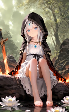 masterpiece,very aware,(highres),absurdres,newest,best quality,high quality,loli,petite,chromatic_aberration,//,loli,1girl,weapon,long_hair,blue_eyes,barefoot,soaking_feet,jewelry,water,sitting,flower,hooded_cloak,sword,necklace,dress,white_dress,cloak,hood,pendant,white_hair,black_cloak,black_ribbon,very_long_hair,looking_at_viewer,white_flower,petals,ribbon,lotus,hood_up,1boy,ripples,short_sleeves,full_body,1other,fire,parted_lips,feet,wet,hair_ornament,bare_legs,nature,falling_petals,tree,oily skin,shiny skin,//,//,<lora:nai4zhengliu——【noob】hans:1>,