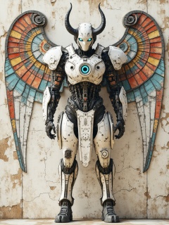 miluo_jqgk,A badass, humanoid robot stands against an ancient, worn stone wall. This metal beast has a white and black exoskeleton with glowing blue bits, big-ass wings with intricate designs, and two black horns. Its face is a mix of mechanical and human-like features. The scene mixes sci-fi with ancient vibes. <lora:米洛丨机器怪咖v1.3:1>