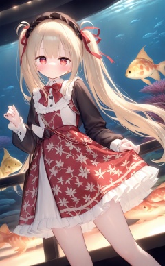 masterpiece,very aware,highres,absurdres,newest,best quality,high quality,loli,petite,chromatic_aberration,//,(loli) standing,frilled dress,golden long hair,twintails,bowtie,beautiful eyes,shamed,dynamic angle,aquarium,fishes,flower patterned dress,crystal,//,year_2023,year_2024,<lora:loli Style——【noob】hans:1>,