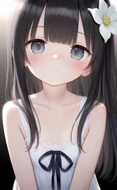 masterpiece,very aware,highres,absurdres,newest,best quality,high quality,loli,petite,chromatic_aberration,//,(loli),1girl,flower,hair ornament,long hair,hair flower,solo,black hair,black background,looking at viewer,simple background,upper body,white dress,dress,blunt bangs,blush,closed mouth,white flower,expressionless,collarbone,black eyes,grey eyes,//,year_2023,year_2024,<lora:loli Style——【noob】hans:1>,
