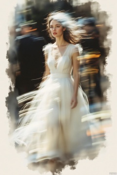 Ink and wash abstract concept blockbuster, girl's moon white dress and ink strokes blend, hair presents a calligraphic white effect, solid color background highlights silk luster, asymmetric composition breaks tradition, high-speed synchronous flash solidified clothing fluctuations,Western woman,cinematic texture background,dynamically blurred background