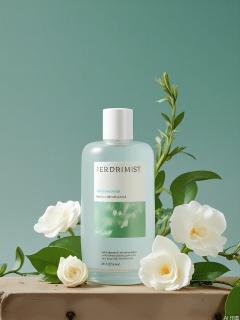 HHCJ, Snapshot of a frosted glass bottle of VerdantMist toner, placed on a rustic wooden shelf, surrounded by sprigs of rosemary and white orchids. The label reads "VerdantMist" with "Soothing Toner" in deep forest green. The background is a muted teal, adorned with dewy green leaves and ivory blooms. Natural, filtered light emphasizes the bottle’s translucent texture and the freshness of the botanicals.