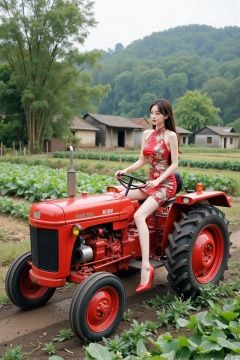 Realistic photo, one young woman, long hair, fair skin, big breasts, backless cheongsam, long legs, red high heels, full body, (driving tractor), fields, vegetable gardens, old houses, bamboo forests, countryside,