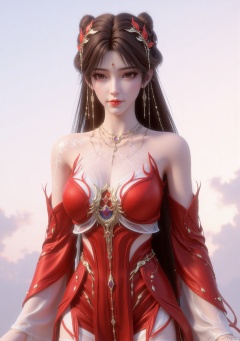 The image depicts a character with long brown hair styled in an elegant braid, adorned with red and gold accessories. The character is wearing a red and white outfit with intricate designs, including a prominent golden emblem on the chest. The background is a soft, cloudy sky, giving a serene and ethereal atmosphere to the scene.
