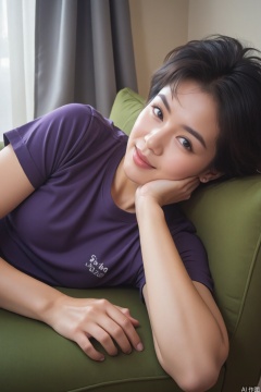 The image shows a person lying on a green couch. The person is wearing a purple t-shirt with some text on it. The person has curly hair and is resting their head on their left hand. The background includes a curtain and a wall, with some natural light coming in, creating a warm and soft ambiance.