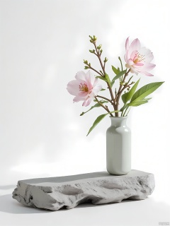 A photograph of a serene scene with a branch of cherry blossoms in a low, rectangular vase, positioned diagonally on a light gray slate surface. The blossoms are delicate and pale pink, with green leaves adding a touch of contrast. The background is a muted white, allowing the flowers to take center stage. Soft, diffused light highlights the blossoms’ intricate details and the vase’s clean lines.