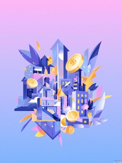 XSYY, A vibrant, abstract digital artwork featuring a mix of geometric shapes and symbols, including gold coins, dollar signs, arrows, and buildings, all set against a gradient background transitioning from pink to blue. The colors are predominantly shades of blue, purple, and gold, creating a dynamic and energetic feel. The shapes overlap and intersect in a complex, layered composition, giving the impression of depth and movement. The style is modern and minimalist, with a focus on bold, contrasting colors and clean lines.