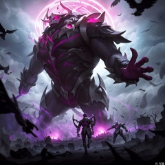 The image depicts a dark fantasy scene with a large, menacing creature in the center. The creature has a muscular build, covered in dark, spiky armor, and glowing red eyes that exude an intense, otherworldly energy. Its body is adorned with intricate, glowing pink and purple patterns, suggesting magical or supernatural properties. The creature's wings are large and bat-like, with a similar glowing pink hue.