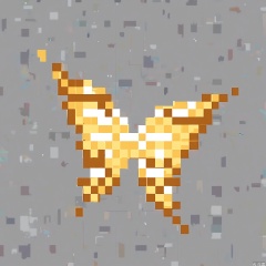 XSF, A pixel art new arrival badge, shining in shades of gold and yellow, with a pixelated ribbon wrapped around it.