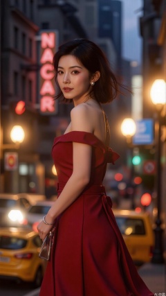 As the evening lights come on, the urban streets are bustling with traffic and neon lights flickering. A tall and elegant urban beauty stands gracefully, becoming the focus of the picture. She has a delicate face, deep eyes, and her short and neat hair adds a sense of competence. Wearing a red off-the-shoulder evening dress, the skirt flutters in the wind, and she holds an exquisite handbag. In the blurred background, the car lights and neon lights interweave into a dreamy light and shadow, setting off her elegance. Under the close-up lens, every detail of her exudes charming charm, as if you can hear the nocturne played by the city for her.