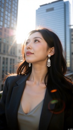 Shot from a low angle, the urban woman glances back over her shoulder, sharp jawline accentuated. Diamond fringe earrings catch the light, pairing a silk camisole with a charcoal blazer—modern yet feminine. Glass skyscrapers reflect morning light, creating a dynamic composition.