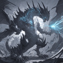 The image depicts a highly detailed and dynamic illustration of a dragon-like creature. The creature is primarily silver and blue, with intricate patterns and sharp, angular features that suggest a powerful and formidable presence. Its wings are large and spread wide, with a metallic sheen that complements its overall silver and blue color scheme. The creature's body is muscular and robust, with sharp claws and teeth visible in its open mouth, giving it a fierce and intimidating appearance.