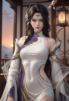 Xuan_yi,1girl,dress,black hair,long hair,hair ornament,jewelry,brown eyes,circlet,<lora:Xuan_yi25_pony-000002:0.75>,white dress,detached sleeves,chinese clothes,white heels,shawl,side slit,photorealistic,hyperrealistic,(pale skin:1.5),<lora:Skin Color slider by topplok2:-1>,looking at viewer,score_9,score_8_up,score_7_up,score_6_up,score_9,score_8_up,score_7_up,score_6_up source_anime,standing,(upper body:1.2),close up,head shot,lantern,open window,looking at viewer,indoors,mountains,blossoms,flowers,east asian architecture,beautiful sunrise,warm ambient temperature,