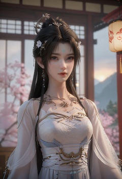 Qing_yi,1girl,jewelry,long hair,hair ornament,solo,earrings,necklace,hair bun,black hair,blurry background,forehead mark,facial mark,hair flower,<lora:Qing_yi25_pony-000002:0.75>,white dress,long sleeves,chinese clothes,score_9,score_8_up,score_7_up,score_6_up,score_9,score_8_up,score_7_up,score_6_up source_anime,looking at viewer,standing,(upper body:1.2),close up,head shot,lantern,open window,looking at viewer,indoors,mountains,blossoms,flowers,east asian architecture,beautiful sunrise,warm ambient temperature,