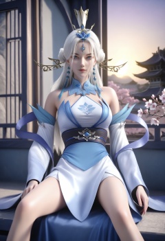 Donghuang_taixin,1girl,hair ornament,white hair,long hair,earrings,jewelry,bare shoulders,bare legs,blurry background,gem,circlet,hair stick,<lora:Donghuang_taixin_10_illu-000005:0.75>,dress,white dress,blue dress,detached sleeves,sash,chinese clothes,wide sleeves,ribbon,photorealistic,hyperrealistic,<lora:realistic filter [IL]:1>,(pale skin:1.1),looking at viewer,sitting,spread legs,(thin thighs:1.2),lantern,open window,looking at viewer,indoors,mountains,blossoms,flowers,east asian architecture,beautiful sunrise,warm ambient temperature,