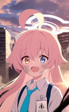 masterpiece,best quality,high quality,loli,1girl,hoshino (blue archive),heterochromia,shirt,solo,pink hair,necktie,white shirt,halo,long hair,blue eyes,fang,blue necktie,ahoge,collared shirt,building,outdoors,yellow eyes,smile,looking at viewer,id card,hair between eyes,open mouth,skyscraper,cloud,sky,upper body,pink halo,dirty,shoulder strap,cloudy sky,aqua necktie,city,dust,:d,cityscape,sunrise,harness,dirty face,skyline,blurry,strap,chest harness,sunlight//,<lora:BA——【noob】hans:1>,