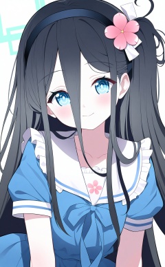 masterpiece,best quality,high quality,1girl, aris_\(blue_archive\), solo, halo, long_hair, blue_eyes, smile, hair_flower, black_hair, flower, looking_at_viewer, hair_ornament, simple_background, white_background, dress, blue_dress, very_long_hair, hairband, hair_between_eyes, closed_mouth, one_side_up, blush, collarbone, pink_flower, upper_body, short_sleeves, leaning_to_the_side, alternate_costume, long_bangs, frills, sailor_collar//,<lora:BA——【noob】hans:1>,