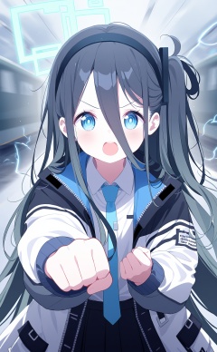 masterpiece,very aware,(highres),absurdres,newest,best quality,high quality,loli,petite,chromatic_aberration,dynamic_angle,cinematic_angle,//,1girl,aris_\(blue_archive\),blue_eyes,solo,jacket,open_mouth,long_hair,black_hair,incoming_attack,ringed_eyes,blue_theme,long_sleeves,clenched_hand,forehead,electricity,white_jacket,hairband,v-shaped_eyebrows,train,upper_teeth_only,looking_at_viewer,black_hairband,one_side_up,teeth,upper_body,//,//,artist:deyui,artist:doremi_(doremi4704),artist:mx2j,artist:yutokamizu,artist:child_(isoliya),//,//,<lora:BA02:0.85>,