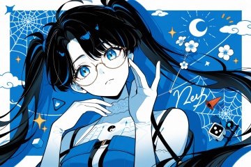1girl,::,__artist__,year 2024,(drop shadow:1.4),(close-up:0.8),(shadow:1.2),(hands up:1.2),(border:1.2),(outside border:1.2),(hand up:1.2),(character name:1.2),from side,hand up,closed mouth,upper body,high contrast,holding cup,frown,looking at another,looking at viewer,rope,portrait,drop shadow,sparkle,^ ^,flag,limited palette,moon,yin yang,bug,notice lines,cloud,spider,traffic cone,star \(symbol\),circle,silk,traffic light,arrow \(symbol\),spider web,blue theme,sun,cube,crescent moon,flower,sunlight,colorful,very awa,masterpiece,best quality,newest,highres,absurdres,<lora:zhezhi-ill-Tanger:0.8>,zhezhi,default clothes,white pantyhose,1girl,long hair,black hair,glasses,twintails,dress,black footwear,