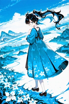 masterpiece,best quality,good quality,very awa,very aesthetic,absurdres,newest,solo,jitome,big eyes,looking at viewer,simple background,1girl,flower,ink and wash,landscape,ink,traditional chinese painting,guofeng,full body,monochrome,looking back,white background,female focus,blue theme,Background Segmentation,Dutch Angle,<lora:ponyv6_noobV1_2_adamW-000017:0.8>,<lora:USNR_STYLE_XL_lokr:0.45>,<lora:mengxuanliart:0.65>,<lora:zhezhi-ill-Tanger:0.8>,zhezhi,default clothes,white pantyhose,1girl,long hair,black hair,glasses,twintails,dress,black footwear,