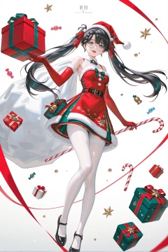 8k,best quality,masterpiece,(ultra-detailed),(high detailed skin),((artist:reoen), (artist:torino_aqua),year 2024:0.8)1girl,[artist:wlop],[artist:ningen_mame],artist:ciloranko,[[artist:rhasta]],artist:tidsean,artist:iumu,artist:nyarko,<lora:zhezhi-ill-Tanger:0.8>,zhezhi,default clothes,white pantyhose,1girl,long hair,black hair,glasses,twintails,dress,black footwear,hat,braid,christmas,santa hat,candy cane,solo,dress,gift,long hair,food,red dress,candy,merry christmas,open mouth,belt,looking at viewer,bangs,smile,full body,sleeveless,bare shoulders,holding,red headwear,red gloves,white background,gloves,bell,santa costume,sleeveless dress,black footwear,shoes,