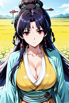 1girl, solo, long hair, breasts, bangs, large breasts, black hair, hair ornament, red eyes, long sleeves, cleavage, jewelry, very long hair, closed mouth, collarbone, earrings, japanese clothes, wide sleeves, parted bangs, sash, facial mark, chinese clothes, forehead mark,hanfu,masterpiece,best quality,official art,extremely detailed CG unity 8k wallpaper,upper body,looking at viewer,flower field,