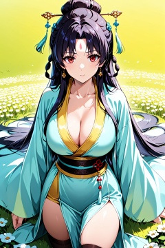 wide sleeves, parted bangs, sash, facial mark, chinese clothes,  hanfu,Thigh exposed,thighhighs,looking at viewer,flower field,