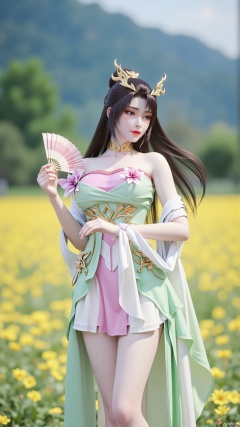 loli,A photograph of an Asian woman in a vibrant, traditional Chinese cheongsam dress featuring pastel hues of green, pink, and white. She gracefully holds a delicate, gold fan, her dark hair intricately styled into buns adorned with pink flowers. She stands confidently in a sunlit field of yellow wildflowers, with a soft, blurred green and blue background. The sunlight casts gentle shadows, enhancing the serene and elegant atmosphere.